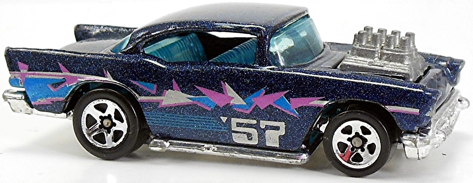 Hot Wheels 1995 - Collector # 290 - Steel Stamp Series 4/4 - '57 Chevy - Midnight Blue Metalflake - 5 Spokes - Blue Tint Windows - USA Blue & White Card - MPN 13277