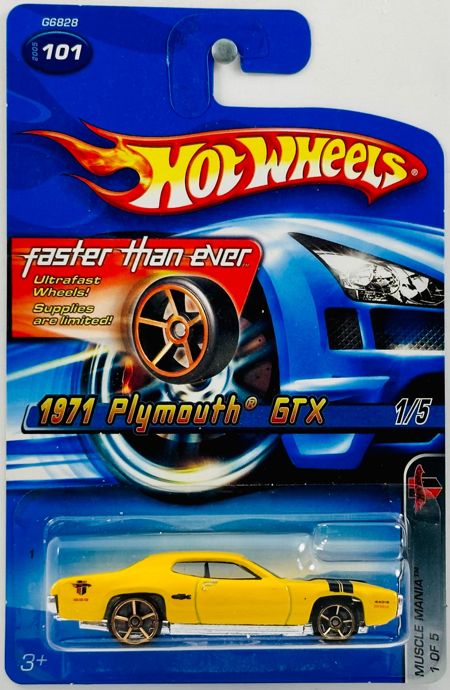 Hot Wheels 2005 - Collector # 101/183 - Muscle Mania 01/05 - Faster Than Ever - 1971 Plymouth GTX - Enamel Yellow - FTE Wheels - Chrome Base - USA Card - MPN G6828