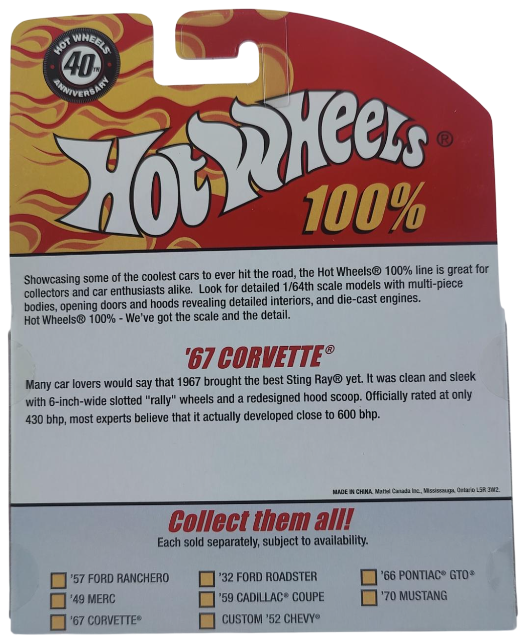 The 1967 Corvette, sometimes called the 1967 Corvette Stingray, is a Hot Wheels casting which was used in the collector-aimed Cool Collectibles and 100% line. It features an opening hood which shows a detailed motor, it also has detailed trim, badges and windshield wipers. It was only used 7 times before being discontinued.