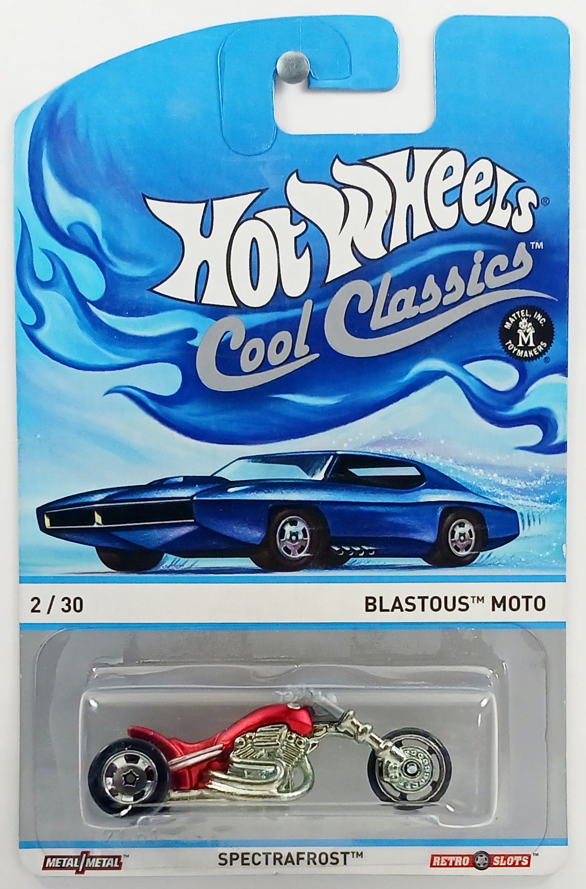 Hot Wheels 2013 - Cool Classics Series # 02/30 - Blastous Moto - Spectrafrost Red - Metal/Metal & Retro Slots - Blue Car Card
