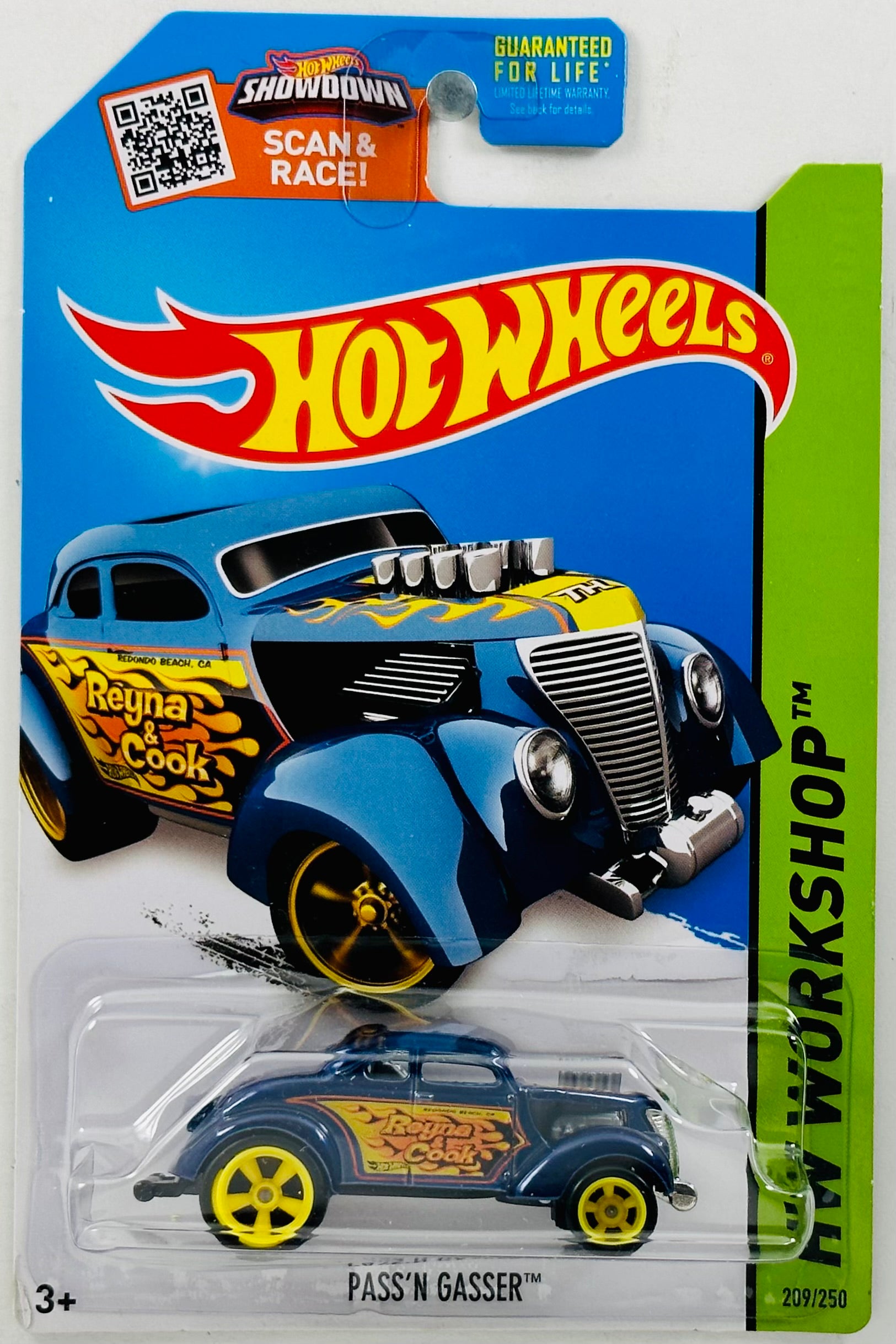 Hot Wheels 2015 - Collector # 209/250 - HW Workshop / Heat Fleet / SUPER Treasure Hunts - Pass'n Gasser - Spectraflame Blue / 'Reyna & Cook' / Black & Orange Flames - Yellow Real Rider 5 Spoke (RR5SP) Wheels - USA 'Scan & Race!' Card