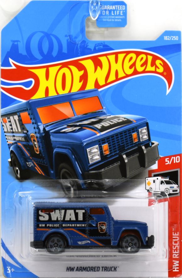 Hot Wheels 2019 - Collector # 182/250 - HW Rescue 5/10 - Treasure Hunts - HW Armored Truck - Dark Blue / SWAT / Circle Flame Logo on Door - USA Card - MPN FYF99