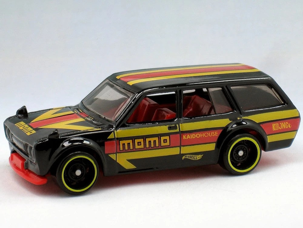 Hot Wheels Wiki says: This casting depicts a heavily modified 1971 Datsun Bluebird 510 wagon with a variety of 1970s-style JDM modifications, including fender mounted mirrors. Several releases of the '71 Datsun Bluebird 510 Wagon exist with a variation in the casting where they come with or without a mesh texture in the grille.