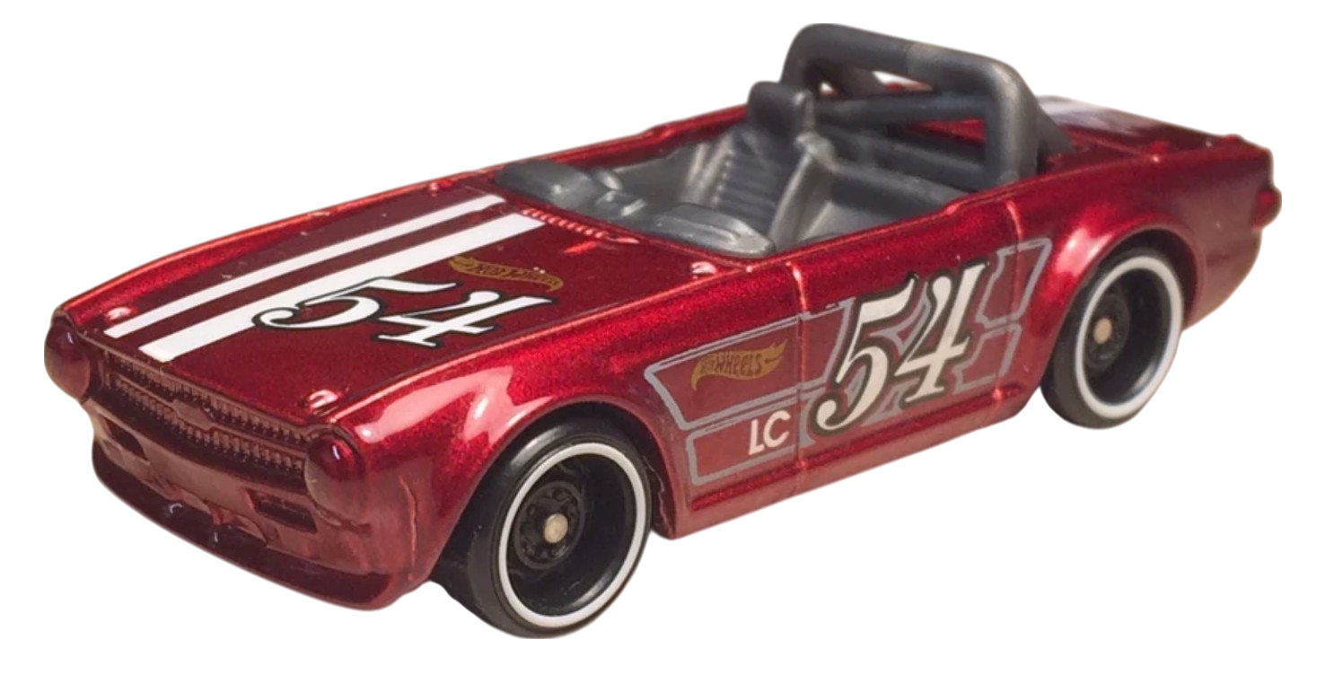 Hot Wheels Wiki says: The Triumph TR6 was a British 2-seat convertible sports car manufactured by the Triumph Motor Company from 1968 to 1976. Styled by Wilhelm Karmann GmbH of Germany, the TR6 was one of the first UK cars of the British Leyland era, a time marked by strikes, shoddy workmanship and highly unreliable cars. It was powered by a 2.5L inline-6 mated to a 4-speed manual. 91,850 were produced from 1968 to 1976, with the vast majority of TR6s being exported to the United States. It would be replaced with the TR7, noted for its wedged shape as styled by Harris Mann.