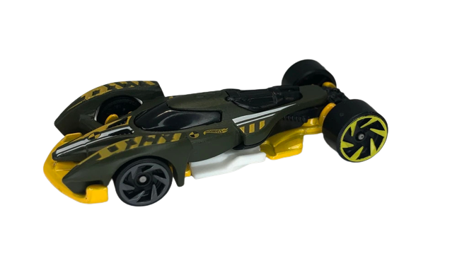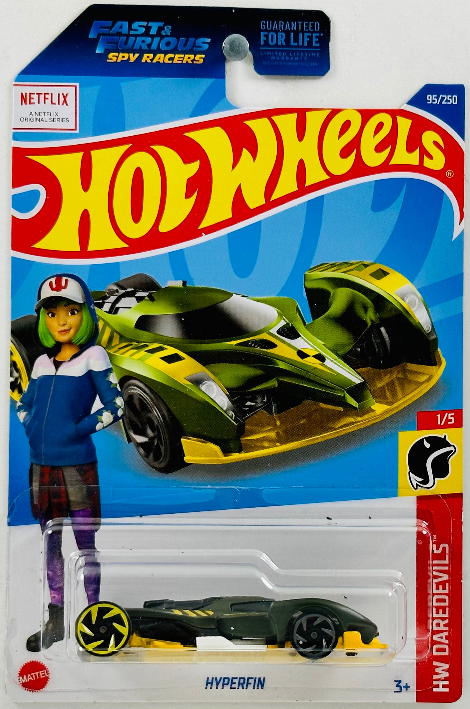 Hot Wheels Wiki says - The Hyperfin is based off the vehicle of the same name in the Netflix animated series, Fast & Furious Spy Racers. This casting features fins that extend sideways to enhance aerodynamics. It is driven by green-haired girl Margaret "Echo" Pearl. It is equipped with nitrous boost, lighting kit, booster rockets and smoke bombs.