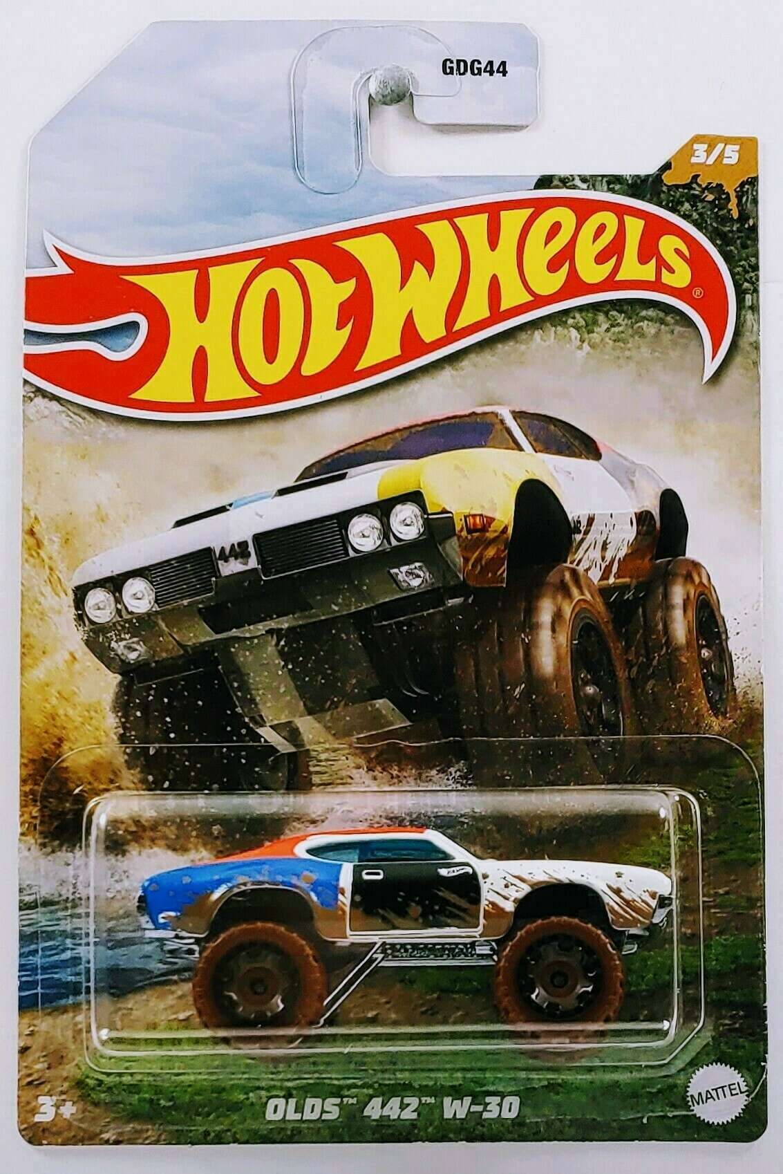 Hot Wheels 2022 - Mud Runners 3/5 - Olds 442 W-30 - Red, White, Blue and Gold - Walmart Exclusive