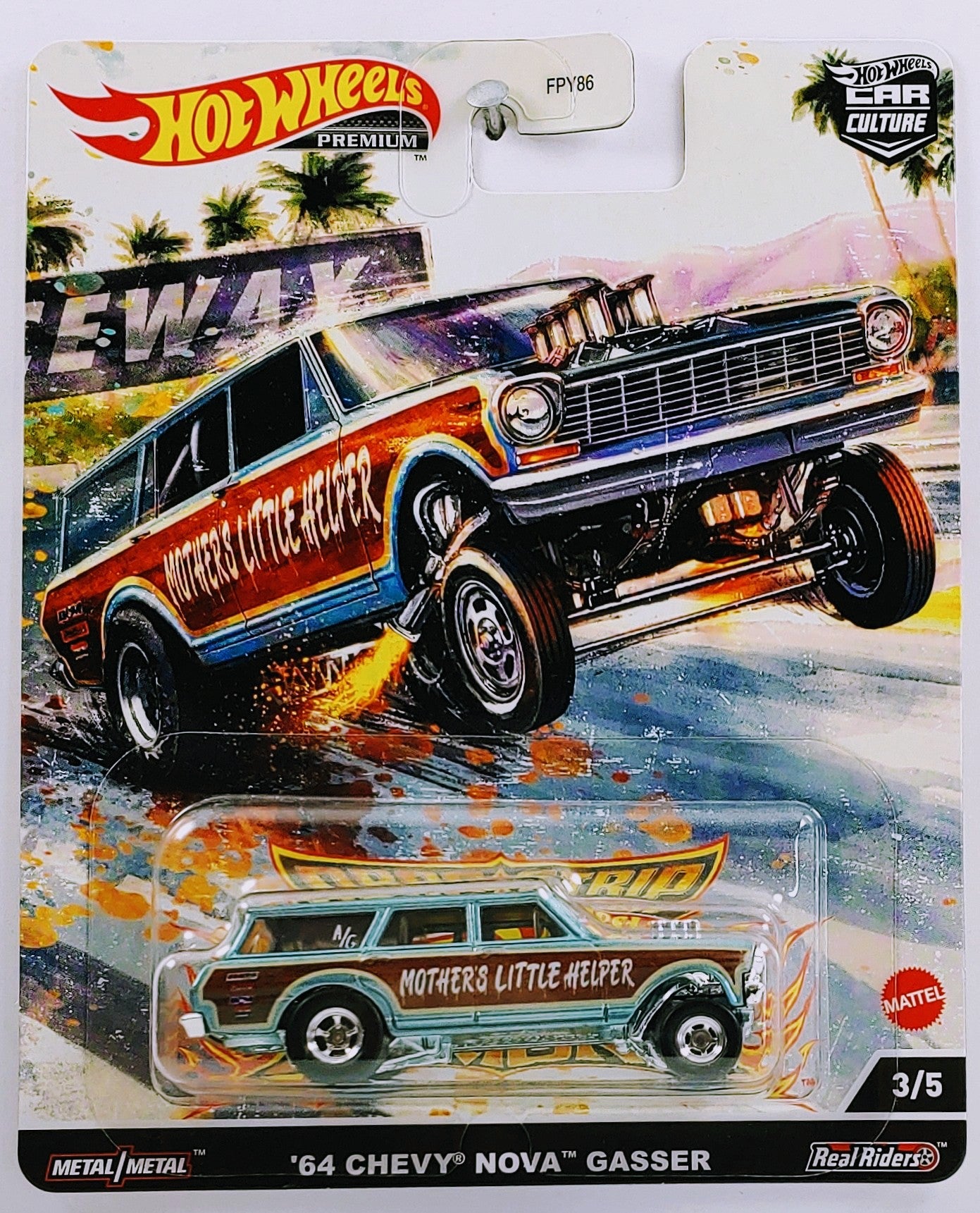 Hot Wheels 2022 - Premium / Car Culture / Drag Strip Demons 3/5 - '64 Chevy Nova Gasser - Blue / Mothers Little Helper - Metal/Metal & Real Riders