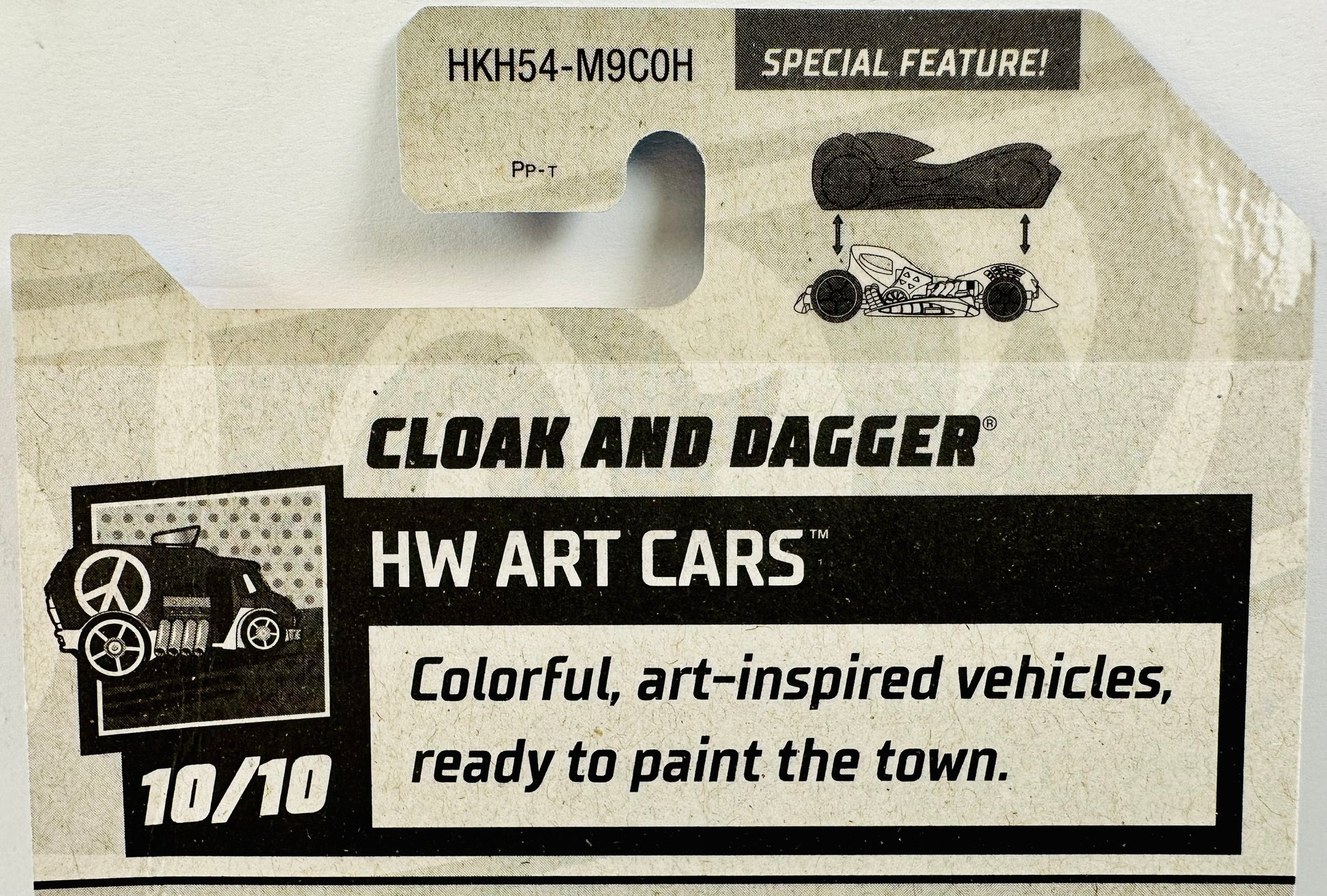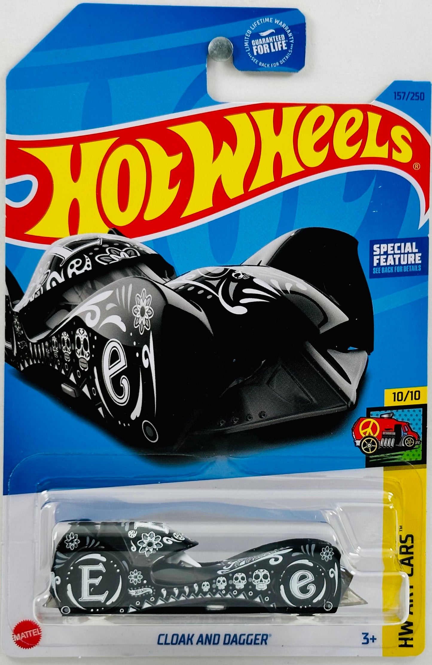 Hot Wheels 2023 - Collector # 157/250 - HW Art Cars 10/10 - Cloak and Dagger - Black - Day of the Dead Artwork / 'E / 'e' - USA Card - MPN HKH54