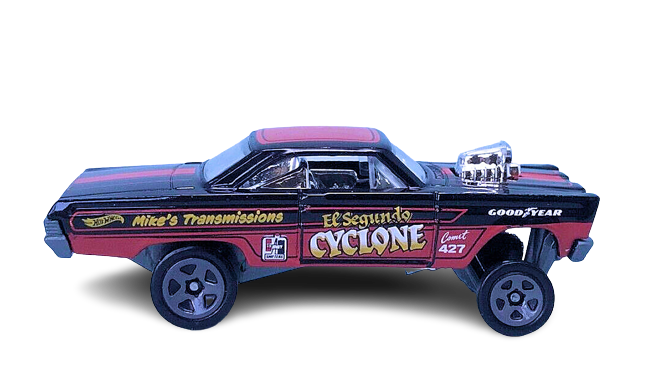 Hot Wheels 2023 - Collector # 199/250 - HW Gassers 04/05 - '65 Mercury Comet Cyclone - Black - 'El Segundo Cyclone' / 'Comet 427' / 'Mike's Transmission' / Red Accents - 5SP (Rear) / SK5SP (Front) Wheels - USA Card - MPN HKH62