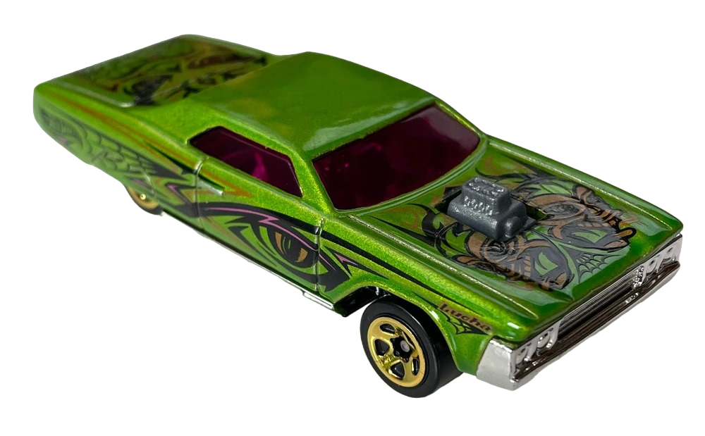 Wiki says: Layin' Lowrider is an unlicensed casting representing a slammed 1960s full-sized automobile with unevenly raised and lowered axles. The casting features a rumbling engine which rocks back and forth when the car is in motion. As a result of this casting's unique construction the interior sits very low into the body and is incomplete with only seats and no dashboard or steering wheel; the seats themselves are cast into the base and are hollow.