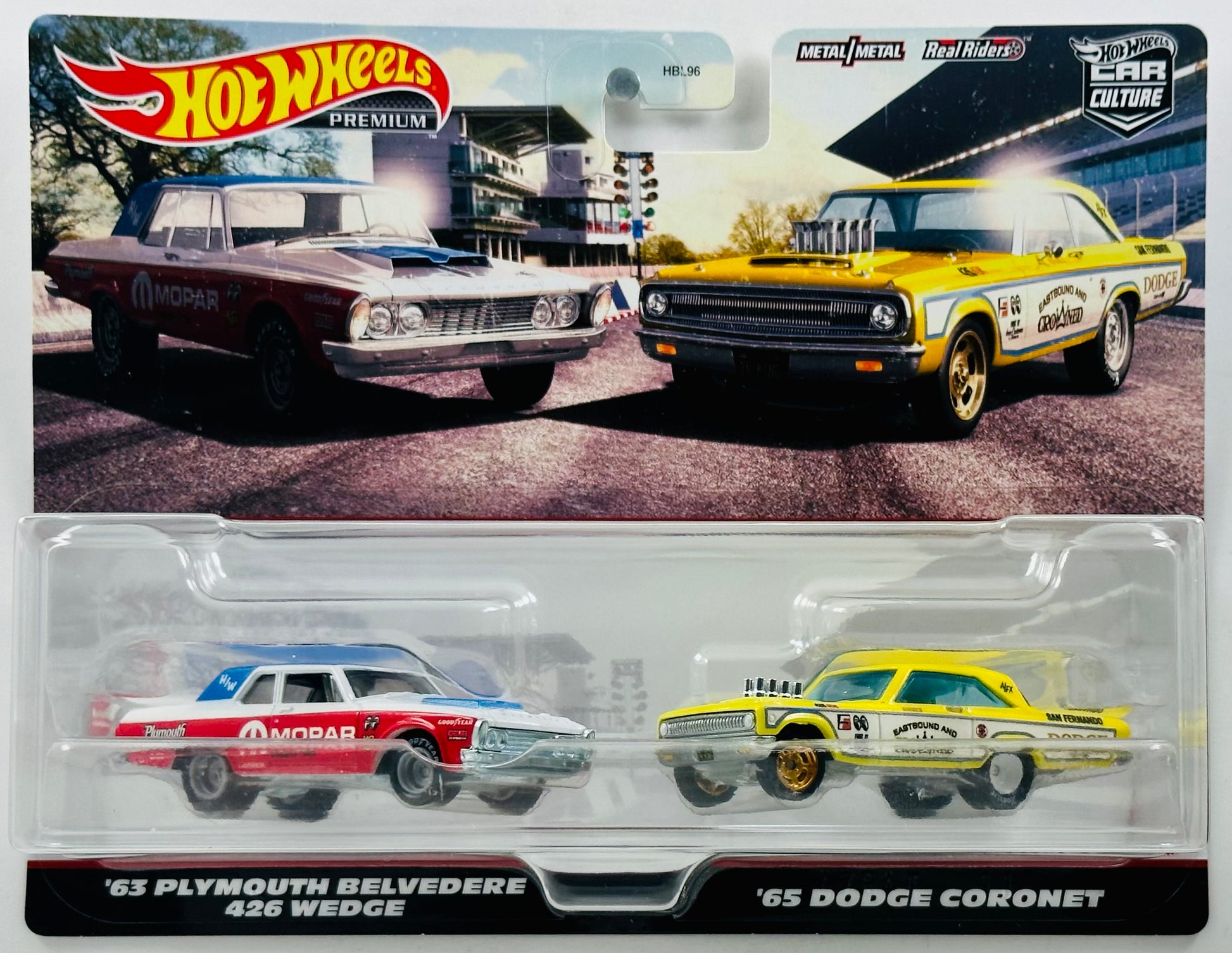 Hot Wheels 2023 - Premium / Car Culture / 2-Pack - Classic Muscle - '63 Plymouth Belvedere 426 Wedge & '65 Dodge Coronet - White, Red and Blue / Yellow - Metal/Metal & Real Riders