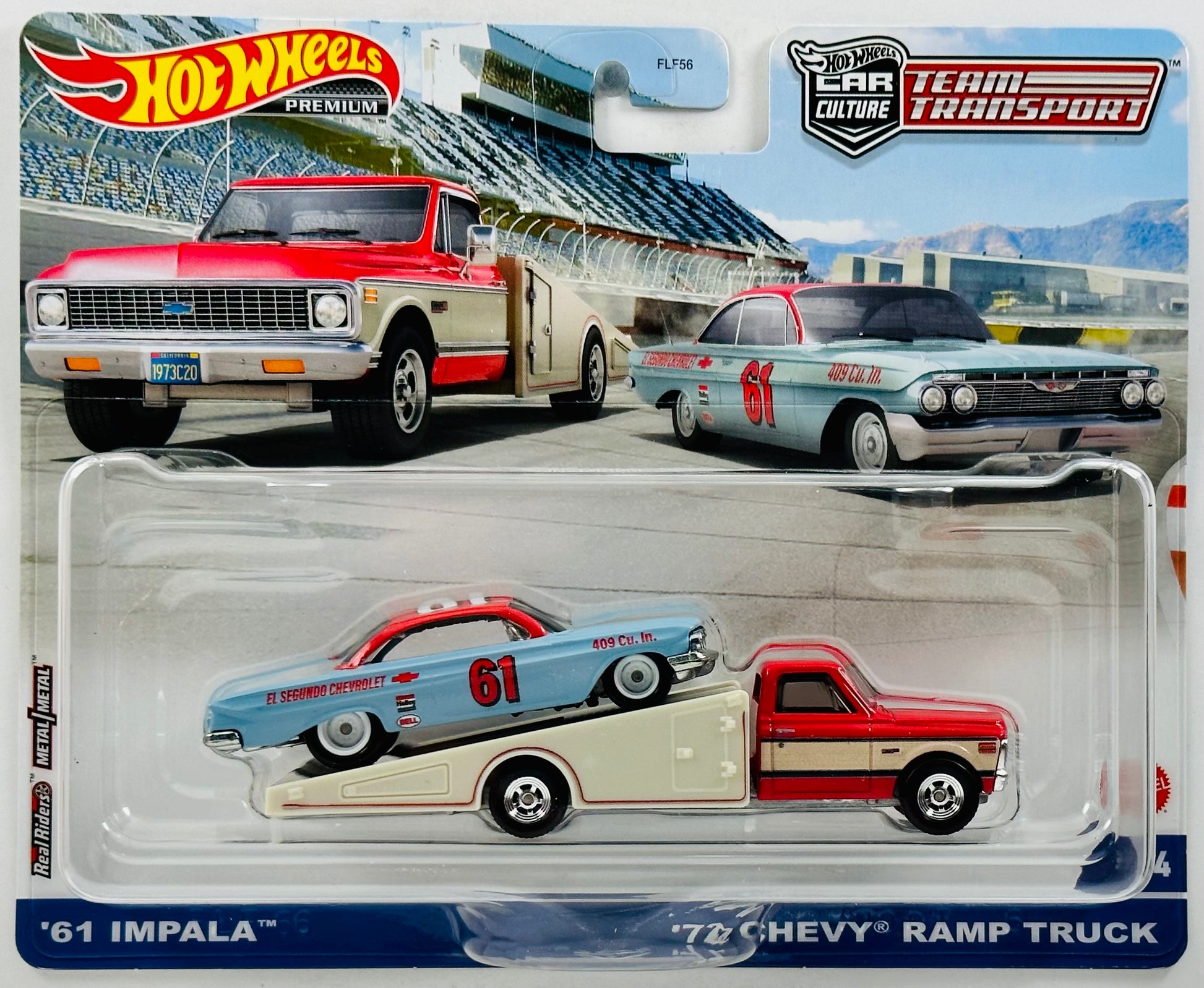 Hot Wheels 2023 - Premium / Car Culture / Team Transport # 54 - '61 Impala, & '72 Chevy Ramp Truck - Red & Powder Blue - Metal/Metal & Real Riders