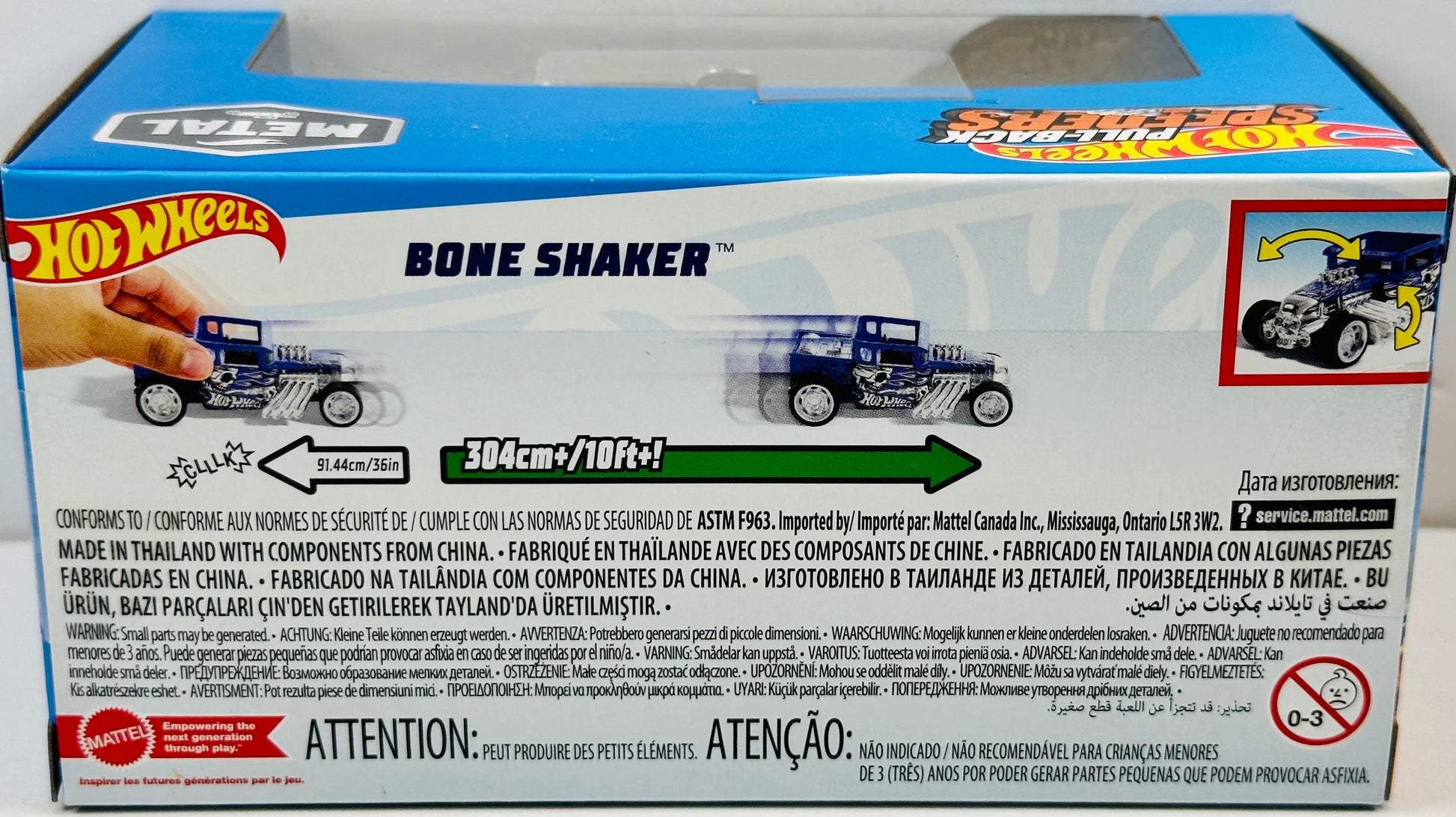 Hot Wheels 2023 - Pull-Back Speeders - Bone Shaker - Dark Blue - White Skull / White & Grey Flames - Metal - Display Box