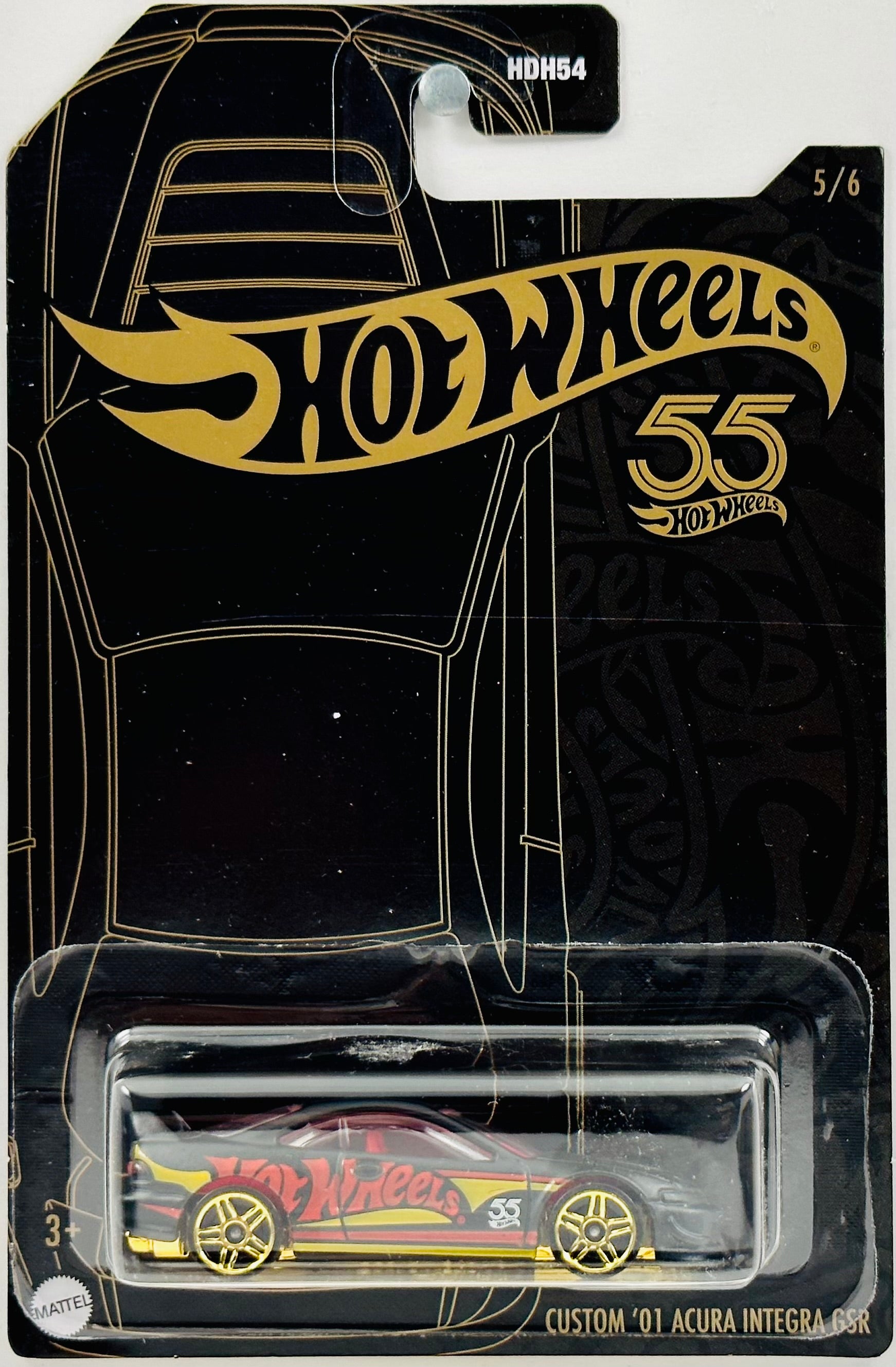 Hot Wheels 2023 - Theme / 55th Anniversary Black & Yellow 05/06 - Custom '01 Acura Integra GSR - Matte Black - Red & Yellow Stripes / 'Hot Wheels' / '55th' on Sides - PR5 Spoke Wheels - Special Blister Card - MPN HLK07