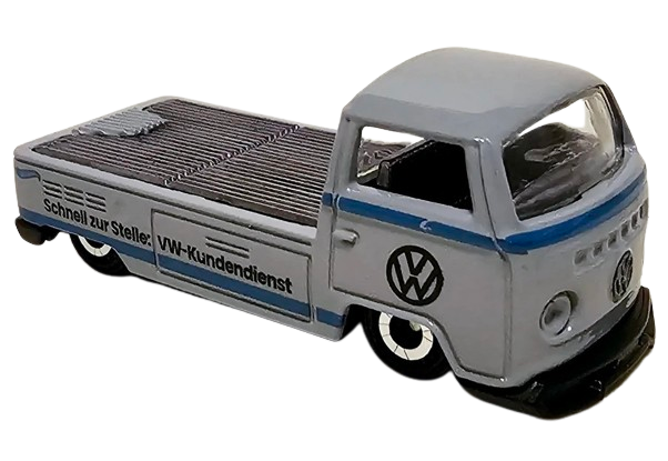 Wiki says: The Volkswagen T2 Pickup is one of many Volkswagen Transporter castings released by Hot Wheels, and is a replication of the 1968 Volkswagen Type 2 Transporter truck as can be seen by the lack of the beetle-inspired V-shaped centerpiece on the front.