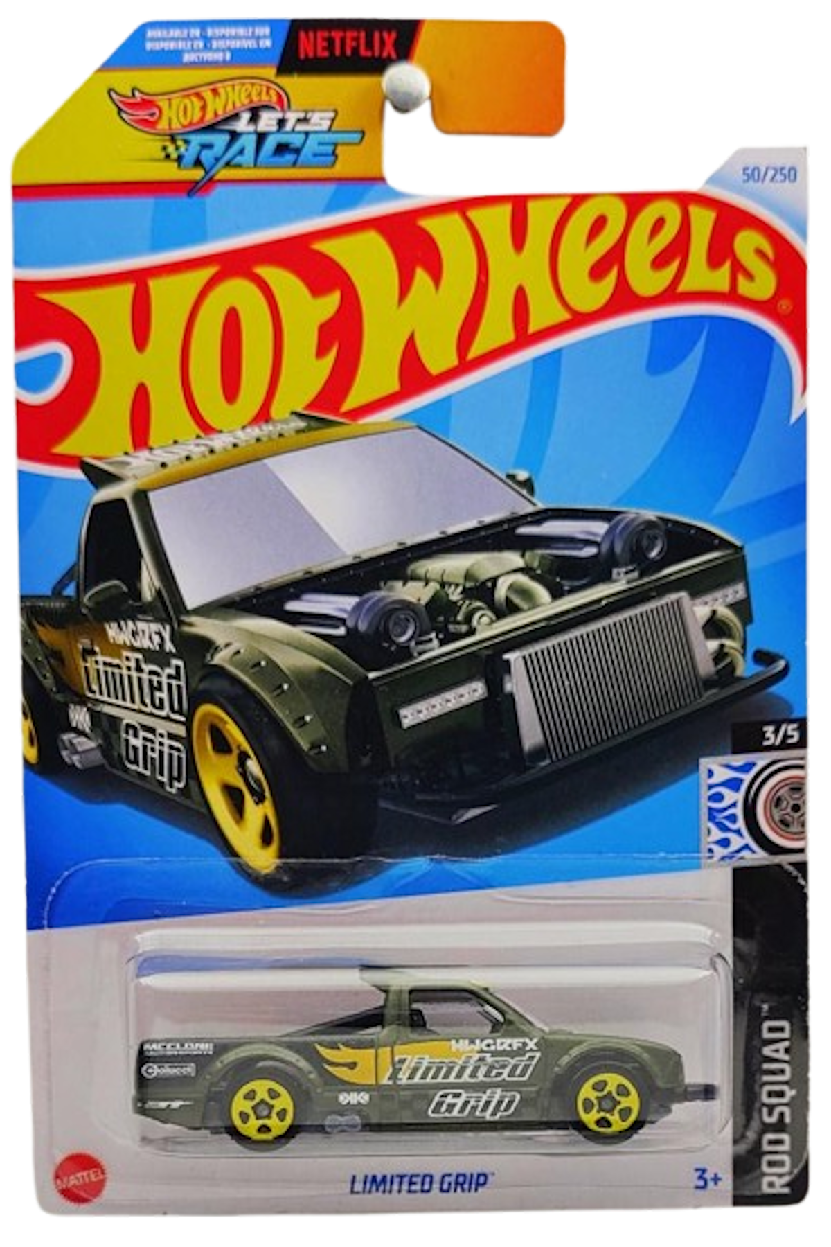 Wiki says: Limited Grip is an unlicensed casting depicting a heavily modified pickup truck intended for drifting, with a removed hood and large wing. The casting is inspired by (but not based on) Bill Speed's Chevrolet S-10 drift truck.