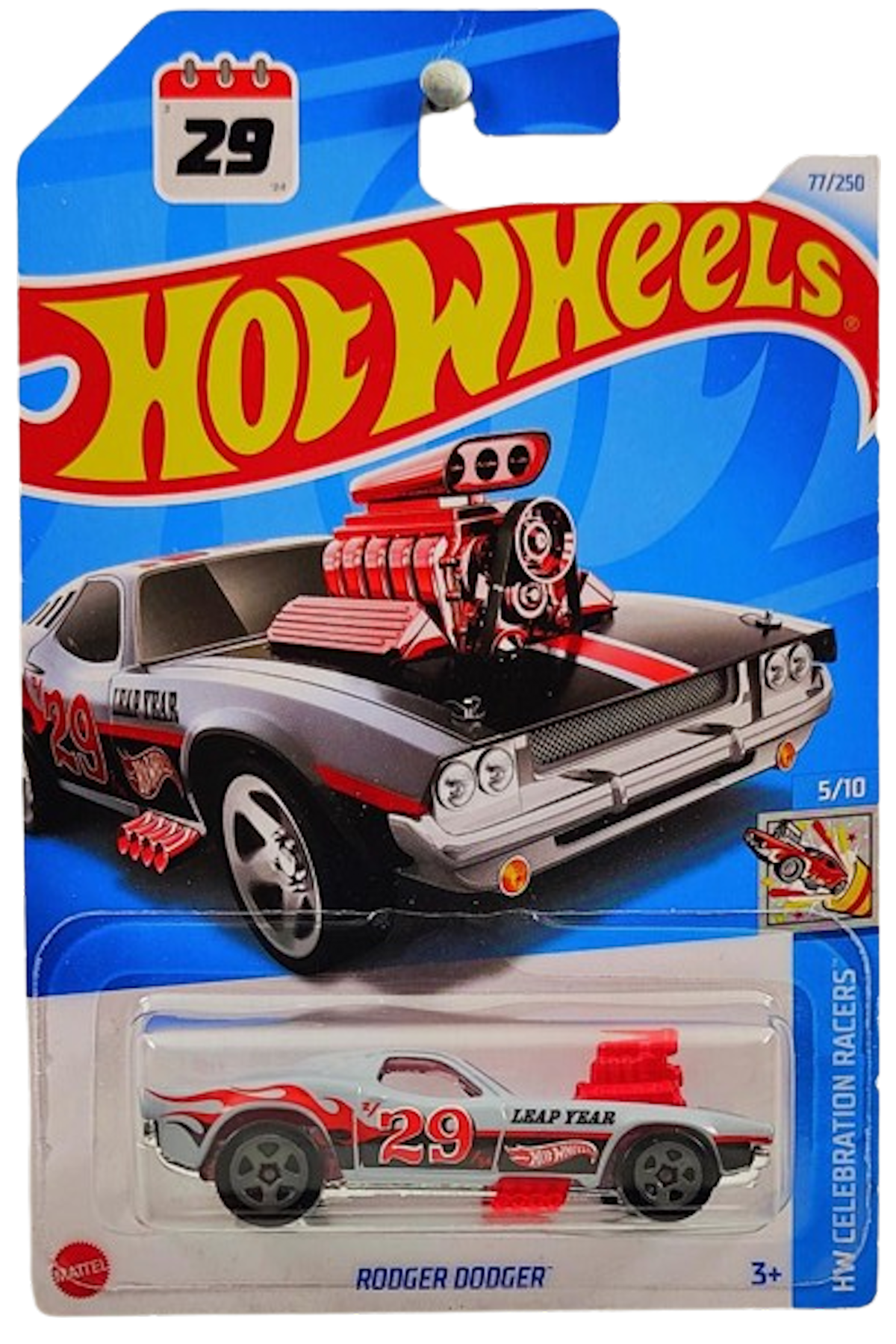 Hot Wheels 2024 - Collector # 077/250 - HW Celebration Racers 5/10 - Rodger Dodger - Gray / #29 / Leap Year - International Card - MPN HRY99
