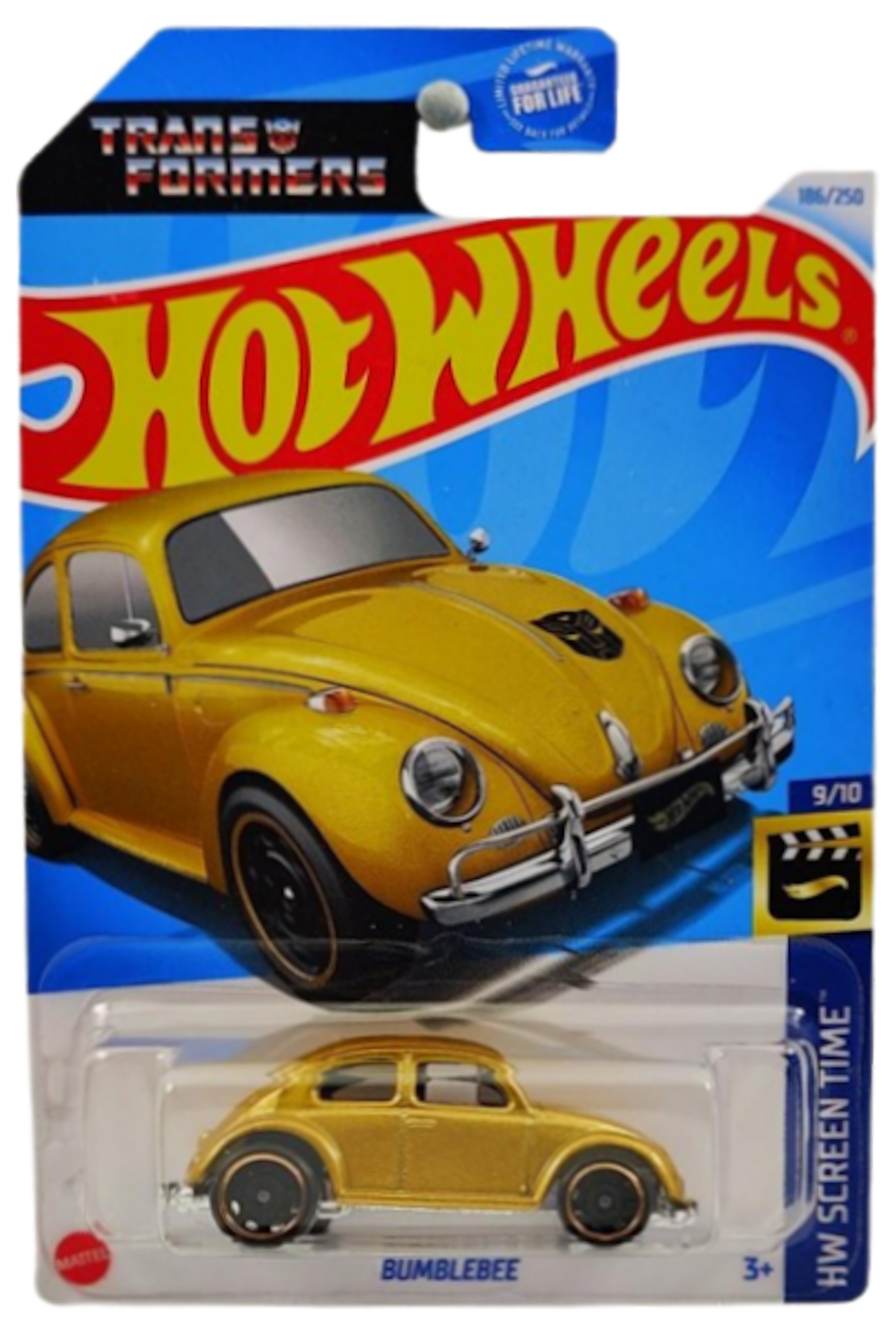 Hot Wheels 2024 - Collector # 186/250 - HW Screen Time 9/10 - Bumblebee (VW Bug) - Metalflake Gold / Transformer Logo on Front Lid - USA 'Transformers' Card - MPN HTF09